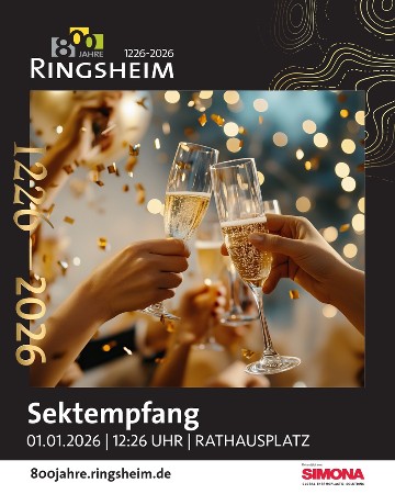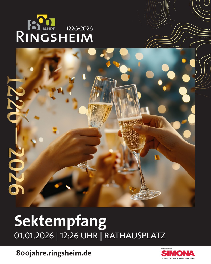 Zum offiziellen Start in unser Jubiläumsjahr laden wir alle Bürgerinnen und Bürger Ringsheims herzlich zu einem festlichen Sektempfang auf den Rathausplatz ein. Stoßen Sie gemeinsam mit uns darauf an, dass unser schönes Ringsheim im Jahr 2026 auf stolze 800 Jahre Geschichte zurückblicken darf.